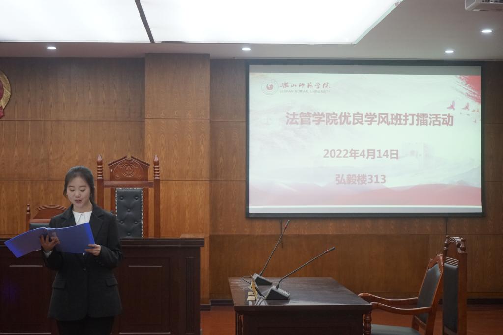 本网讯(文、图/赵丹)为加强学院学风建设,增强学生学习积极性,法学与公共管理学院于4月14日下午,在弘毅楼313举办了2022年度优良学风班打擂活动。学院党总支书记程勇、党总支副书记周琴、学生管理科科长杨兵、19级辅导员何叶出席本次活动,学院主席团成员及部分学生参与此次活动。