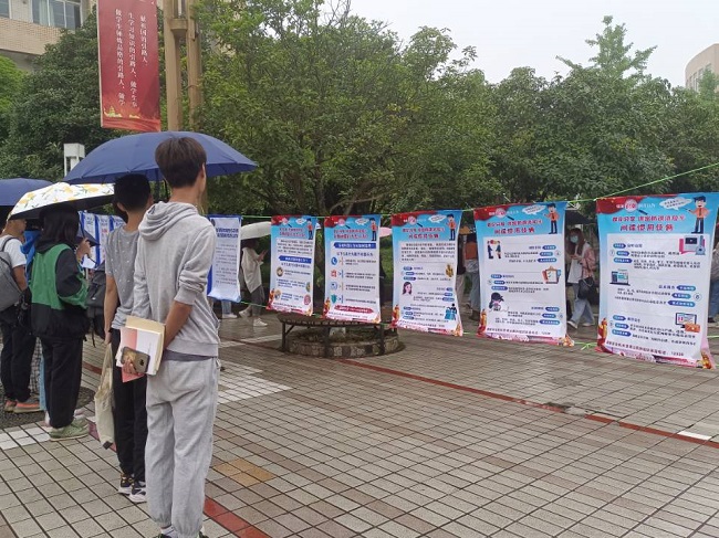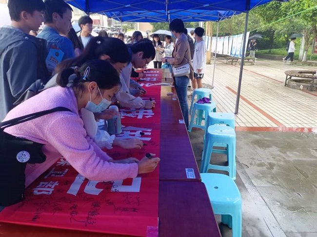 早上十点,同学们陆续来到桂花广场,尽管空中正飘着蒙蒙细雨,却也阻挡不了同学们对国家安全的关注和参与活动的热情。广场上人来人往,在现场工作人员的引导下,同学们都纷纷领取了《中华人民共和国国家安全法》知识手册和《国家安全法律知识手册》,并认真翻阅。随后,同学们还仔细浏览了提前设置在广场上的有关国家安全知识的宣传带,从中了解到国家安全的概念、公民维护国家安全的义务、日常生活中对身边可疑人员的注意事项等相关知识。最后,在工作人员的号召下,同学们拿起手中的笔,在“国家安全从我做起”的条幅上庄重写下自己的名字,并表示将严格践行这一承诺。