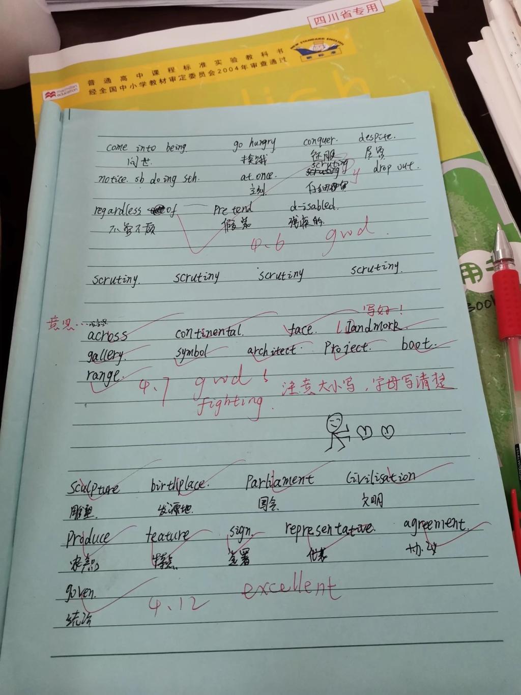 转变思路之后,我更加适应了自己的新身份,也开始针对两个班级的学习做一些“实打实”的计划和事情,比如去观察老教师的英语课堂模式与管理,网上学习一些新奇的教学方法,用心备课,认真对待每一位同学,努力记住每一个同学的名字......当学生感受到真诚与关注后,尤其是当我能注视着某位同学并从容喊出他名字的时候,他会感到惊喜,眼睛里的光一闪一闪。记名字这事还真不容易,但是过程很有趣,学生也开心,我自己做起来也有动力。有一次我突发奇想地在学生听写本上画了简笔画来代替平时写的excellent,没想到他们反应有那么开心,在下次批改的时候还发现有同学也给我回画了简笔画。