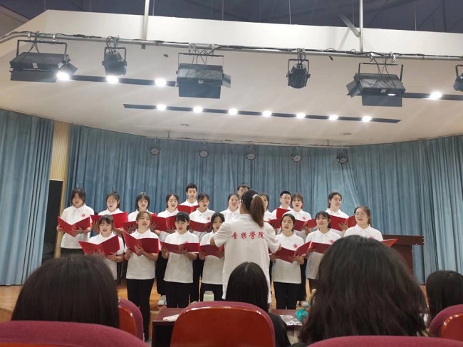 宣讲活动上,音乐学院的同学为大家献唱《国际歌》,激发在场同学们的澎湃热情,活动在热烈的掌声中拉开帷幕。随后,苟胜男同学以中国共产党新民主主义革命时期、社会主义革命和建设时期、改革开放和社会主义现代化建设时期、中国特色社会主义新时代为脉络,结合同学们耳熟能详的红色歌曲以及歌曲背后荡气回肠的故事进行党史讲解。在宣讲过程中,音乐学院教学班同学们结合党史中四个时期,倾情演绎了《我的爱人你可听见》、《英雄赞歌》、《生死相依我苦恋着你》和《祖国颂》四首红色经典歌曲,带领观众回顾建党百年奋进故事,汲取红色精神力量,在音乐的熏陶下,同学们由衷感到中国共产党人始终使命在肩、初心不改。