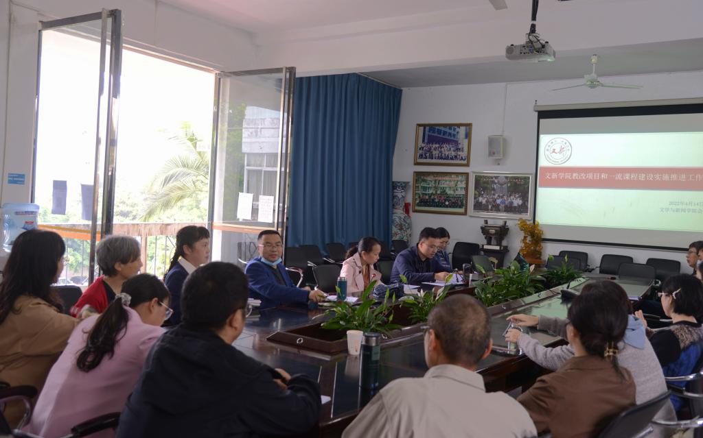 本网讯(文/罗艳图/蔡燕)4月14日下午,文新学院组织召开教改项目和一流课程建设实施推进工作会。党总支书记彭杨、副书记胡平建,副院长杨晓军,以及各教研室主任、在研教改项目负责人、省级和校级一流课程及思政课程负责人参加会议。会议由杨晓军主持。