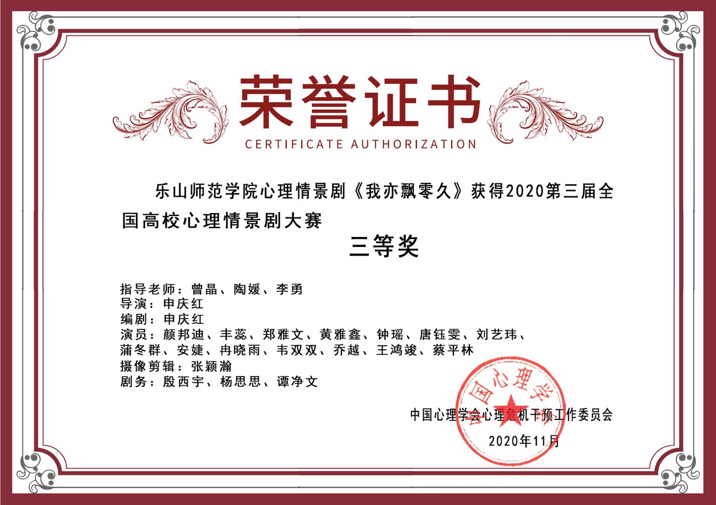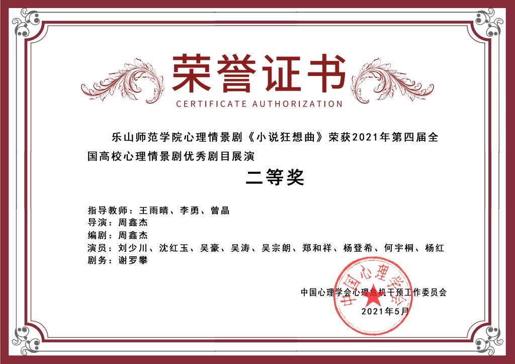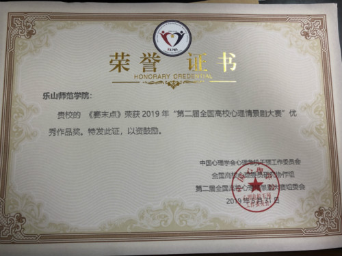 我校连续三年参与全国心理情景剧大赛,并不断取得突破。2019年我校心理情景剧《赛末点》在全国第二届心理情景剧大赛优秀奖,2020年,我校作品《我亦飘零久》获全国第三届心理情景剧大赛三等奖,2021年,我校心理情景剧《小说狂想曲》在全国第四届心理情景剧大赛二等奖,今年我校一等奖作品《未完待续冂中人》即将代表我校参加全国第五届心理情景剧大赛,期待她们获得优异成绩。