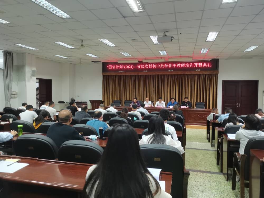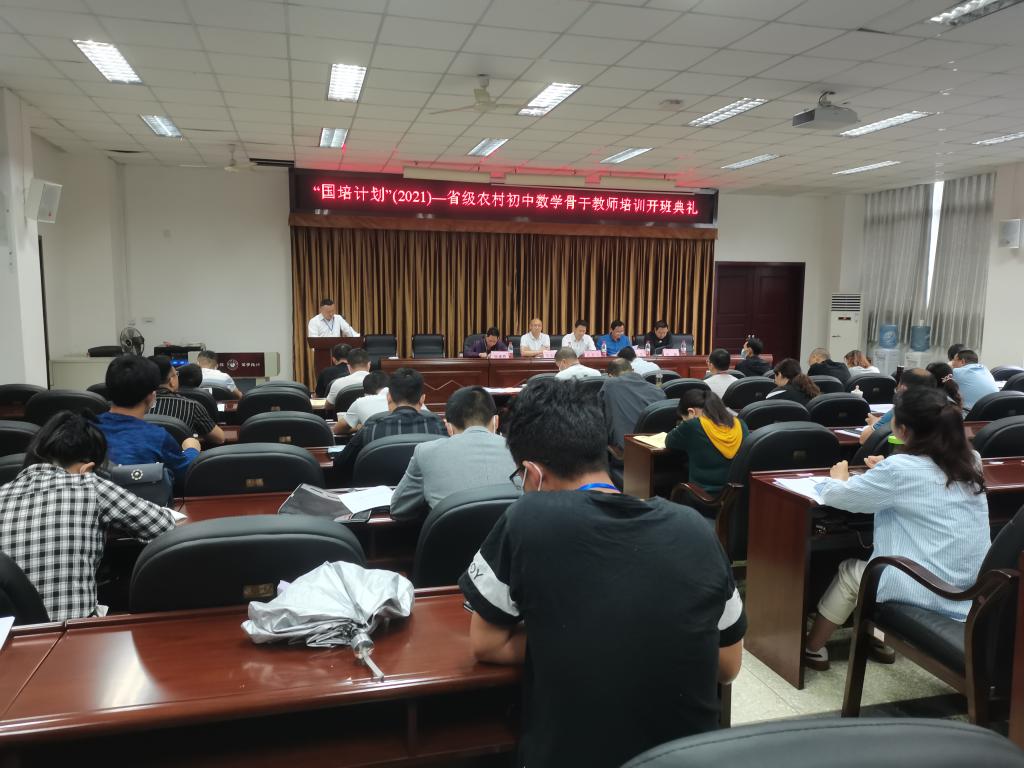 本网讯(文、图/尹艾玲)5月9日上午,“国培计划”(2021)中西部骨干项目——省级农村初中数学骨干教师研修项目开班典礼在弘毅楼312举行,党委常委、副校长汪天飞,数理学院党委书记马力强,数理学院院长屈小兵,数理学院院长助理孙海以及本次培训首席专家杨建辉出席了开班典礼,开班典礼由孙海主持。