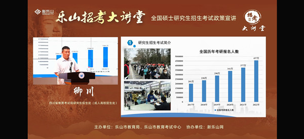 5月13日,由乐山市教育考试中心主办,乐山师范学院承办的“招考大讲堂”,邀请到四川省教育考试院研招处副处长卿川为同学们带来了一场精彩的考研形势分析讲座,讲座由新乐山网向全社会直播。卿川从研究生招生考试简介、近年研究生招生高校情况、研究生招生考试照顾政策、如何填报志愿、如何调剂五个方面全面地为同学们分析了研招考试。活动现场,同学们就研招的全日制与非全日制区别、调剂注意事项、报考注意事项等问题踊跃提问,卿川对同学们切实关心的研招问题进行了深入的解答。除了在场300余名学生参与讲座之外,新乐山网全通道网络直播也吸引了15.7万人次观看。