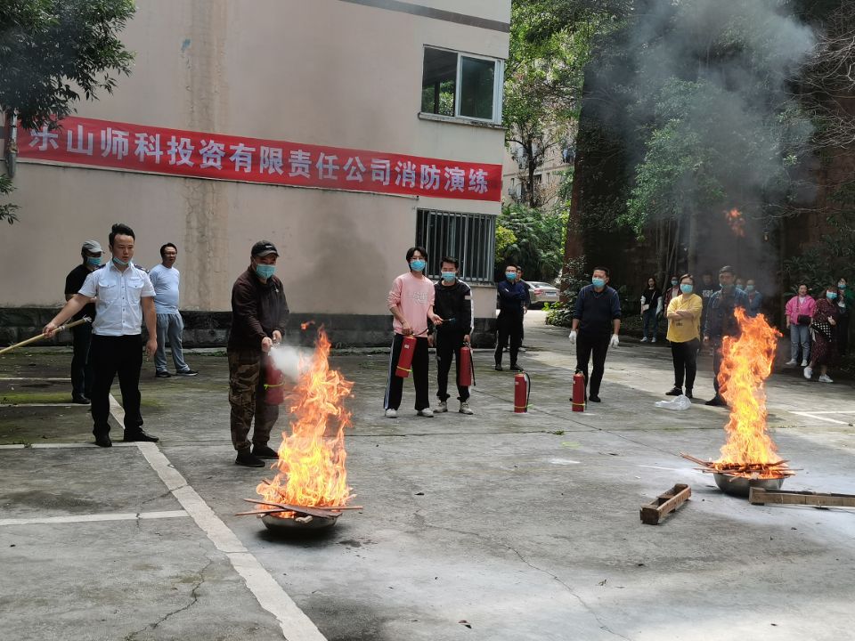 理论培训结束后,所有人员到学生公寓百果苑三幢旁空地进行消防安全演练,由李教官亲自示范并一一指导每位员工正确使用灭火器灭火,树立安全防线,让员工掌握紧急情况下的灭火技能。