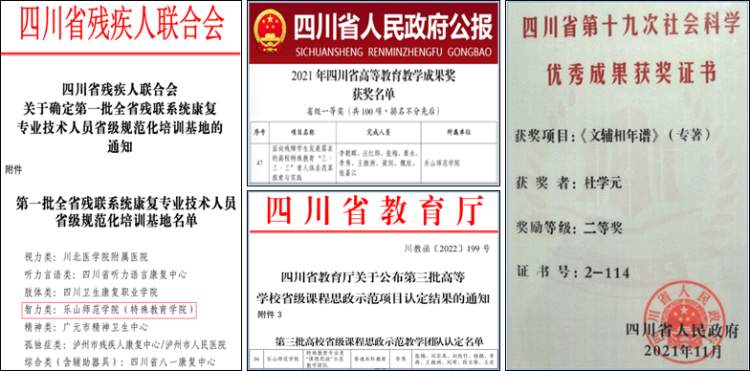 本网讯(文图/刘宗泉)特殊教育学院多年来一直对标申硕标准,加强特殊教育学科内涵建设,进入2022年更是认真贯彻学校“对标竞进攻坚年”战略部署,持续强化申硕工作顶层设计,统一思想,汇聚力量,强规划、重落实,推动学院形成全过程、全方位、多层次、多角度参与的申硕工作格局,取得一些新成效。近半年来,学院被批准为四川省残联系统康复专业技术人员(智力类)省级规范化培训基地,学院教师团队也先后获得四川省教学成果一等奖1项、四川省社会科学优秀成果二等奖1项、四川省高校“课程思政”教学团队1个。
