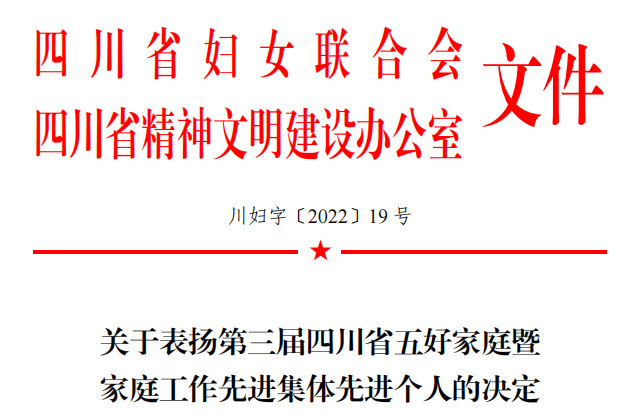 本网讯(文、图/刘兴龙 黄宽娜 )2021 年以来,学校工会和妇联组织坚持以习近平新时代中国特色社会主义思想为指导,认真贯彻落实习近平总书记关于注重家庭、注重家教、注重家风的重要指示精神,以培育和践行社会主义核心价值观为根本, 以五好家庭创建活动为载体,以爱岗敬业为抓手,积极开展了家庭文明建设活动。在2022年第三届四川省五好家庭创建活动中,我校教师胡霞家庭荣获四川省五好家庭荣誉称号。