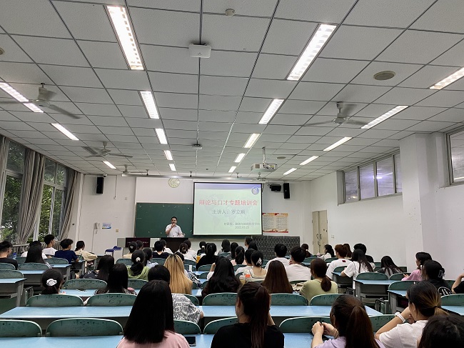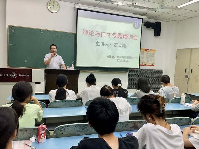 本网讯(文/韩洋 图/肖雨蕾)为提高同学们的思辨、探索、统筹能力,挖掘辩论才能,5月25日,由校团委、旅游与地理科学学院组织的辩论与口才专题讲座在行知楼111教室举行。本次讲座由教育科学学院党委书记罗立顺主讲,旅游与地理科学学院辅导员江纳、喻剑及数理学院辅导员郑新美、即将参加学校辩论赛决赛以及热爱辩论的同学们早早地来到了教室里。