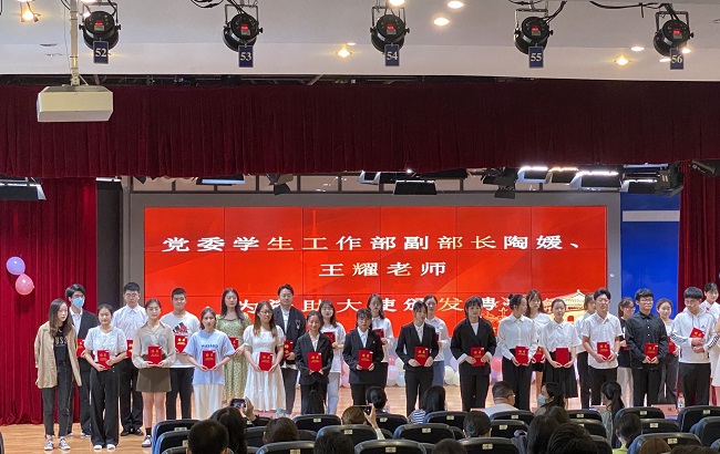 党委学生工作部副部长陶媛为29名“学生资助宣传大使”颁发聘书。“学生资助宣传大使”代表罗培杰作了发言,分享了她的心路历程。陶媛作了讲话,希望同学们不忘初心、牢记使命、勤思敏学。