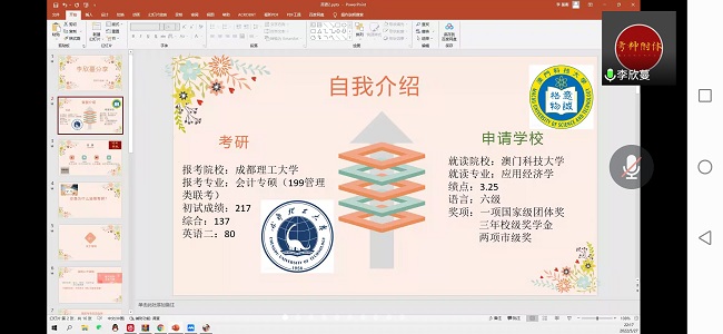 2022届考研上岸的陈倩、肖希、游婷、顾般若、袁立燃、李欣蔓、余星瑶等为大家分享考研经验以及注意事项,这几位同学分别作为考取本专业、一志愿高分、跨考、出国出境等代表,围绕考研前的择校、考研中的学习态度以及生活环境等方面提供了切实有效建议。整场分享会历时两个半小时,为我院2023届考研学生找准定位、打好考研攻坚战提供了思想和方法方面的准备,也是我院深化考研工作、提升考研成效的有利举措。接下来,学院还将会从考研指导、后勤保障、思想建设等方面进一步落实学校考研动员大会的会议精神。