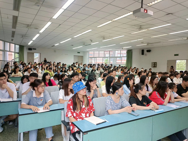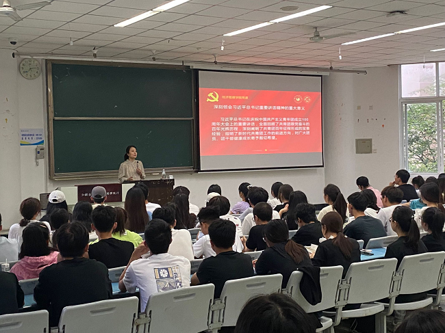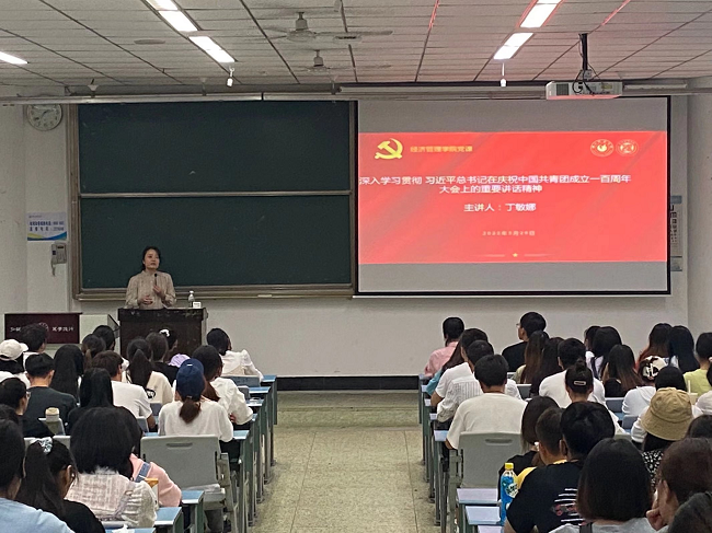 本网讯(文、图/欧佳萍)5月29日晚,经济管理学院在行知楼教室开展学习习近平总书记在庆祝中国共产主义青年团成立100周年大会上的讲话精神,专题学习由学院党委副书记丁敏娜主讲,学院所有党员学生、团学干部、各班主要班委、各类奖学金获得者共计200余人参加了本次学习会。