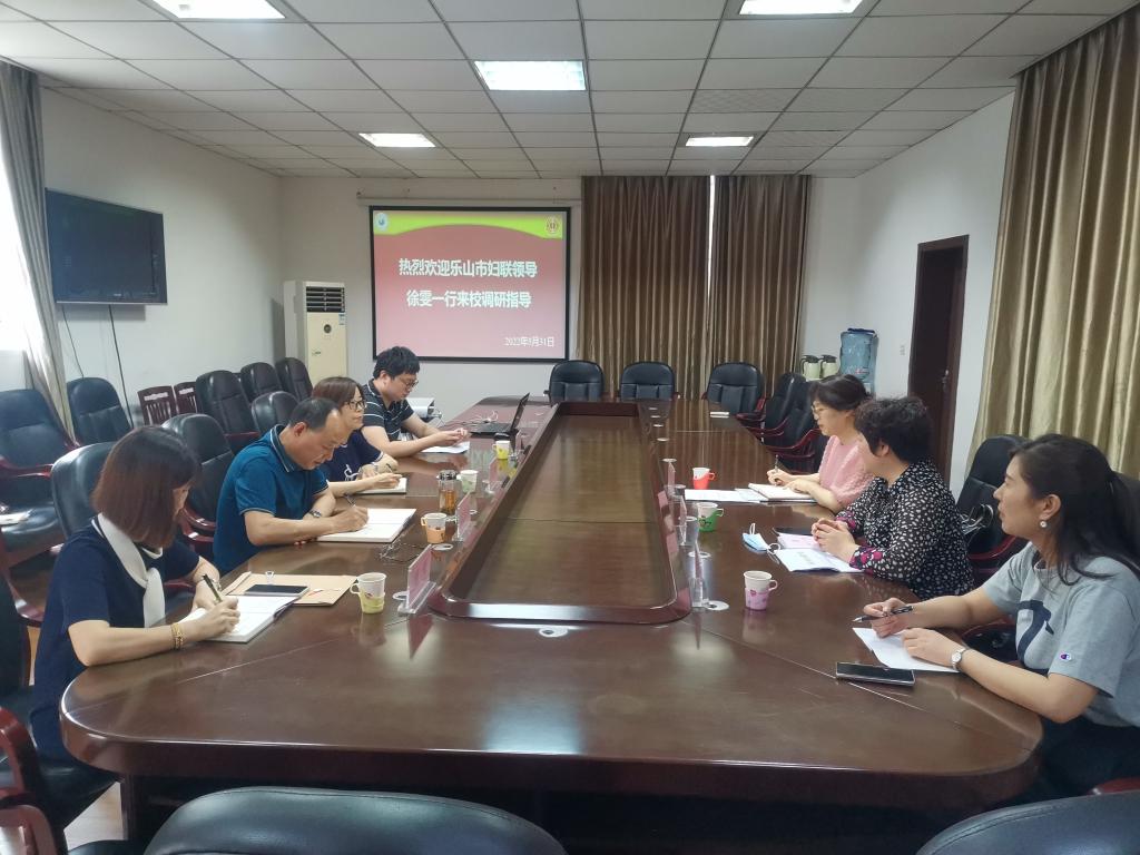本网讯(文/黄宽娜 图/刘兴龙)5月31日,乐山市妇联党组成员副主席徐雯、发展部部长李红英、组宣部部长郑学丹等一行到校工会开展工作调研。校工会常务副主席向清祥、校党委组织部副部长周琴、校工会兼职副主席黄宽娜以及学工部廖盛荣参与调研座谈会,会议由向清祥主持。