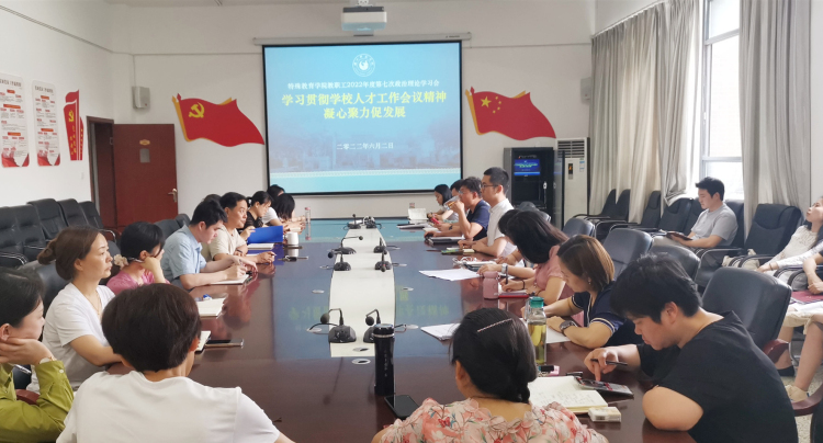 本网讯(文 图/张敏) 6月2日下午,特殊教育学院在特教大楼A栋408会议室举行了2022年度第七次教职工政治理论学习会,专题学习贯彻学校人才工作会议精神。学习会由学院党委书记刘宗泉主持。