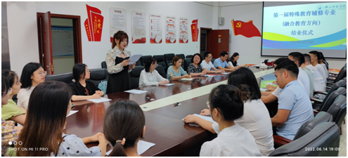 第一届辅修特殊教育专业(融合教育方向)的学生共有32名,分别来自数理学院和文新学院,其中数理学院30人,文新学院2人,修完全部课程且考核全部合格。张梅肯定了特殊教育学院近年来在融合教育师资培养工作中取得的成绩。对在座的同学们圆满完成学习任务、顺利结业表示祝贺,同时希望同学们继续努力,将辅修专业与本专业结合,勇于承担融合教育工作,利用所学为普通学校的特殊需要学生解决难题,不断加强特殊教育专业的理论与实践学习,争取做一个出色的融合教育教师。