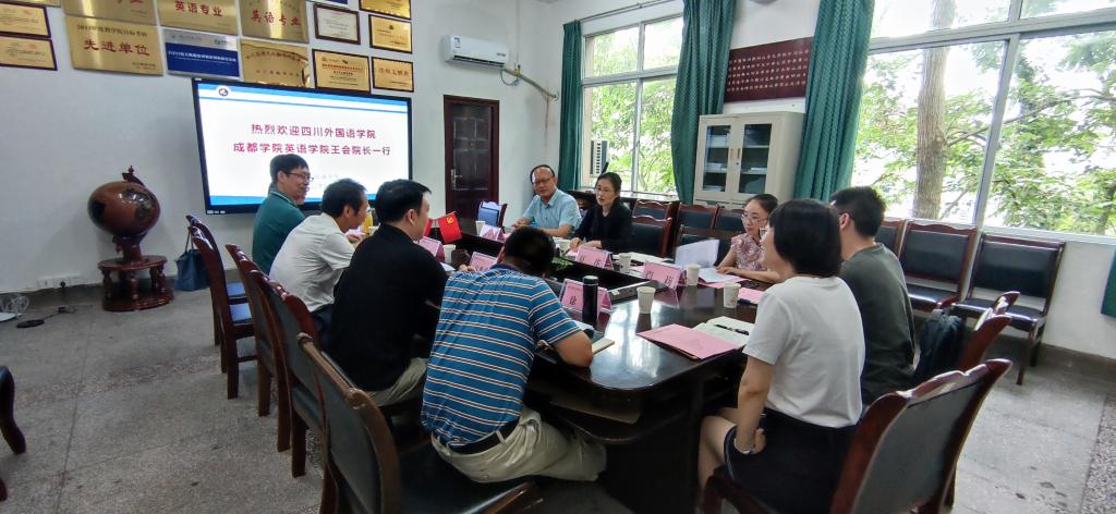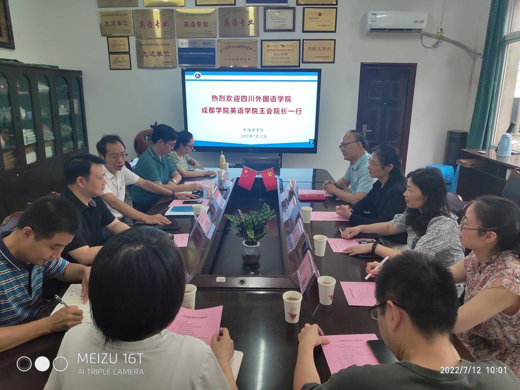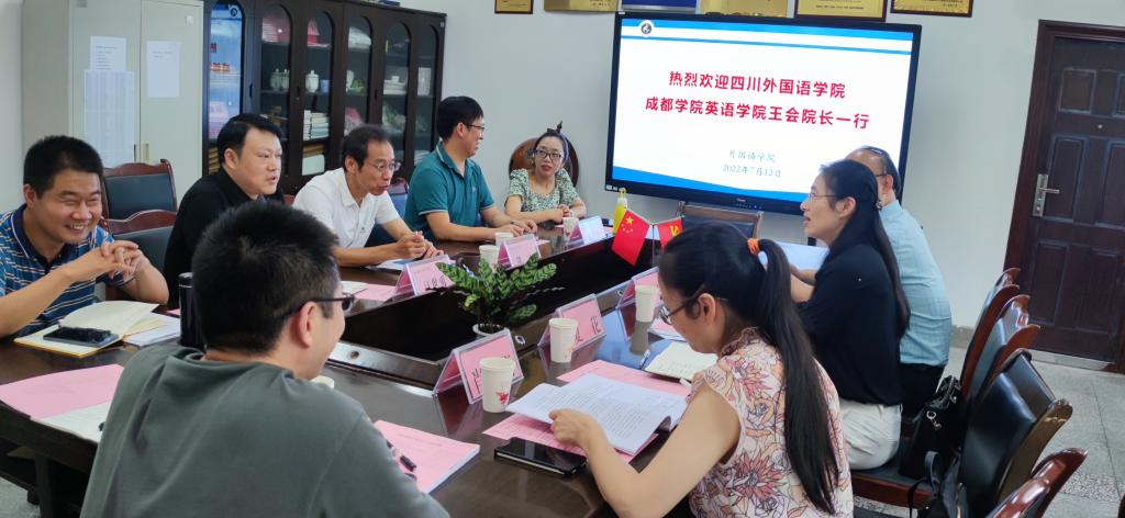 本网讯(文/张丽梅 图/梁霞)7月12日上午,四川外国语大学成都学院英语学院院长王会、学院党委书记刘书坤、院长助理夏花和实践教学部主任肖莉一行4人来我院考察交流。外国语学院党委书记熊文、主持行政工作副院长江世勇、副院长徐波、副院长陈开富、英语专业负责人王柯芦、英语系主任张丽梅和学科教学骨干教师曾正平出席交流座谈会。会议由江世勇主持。