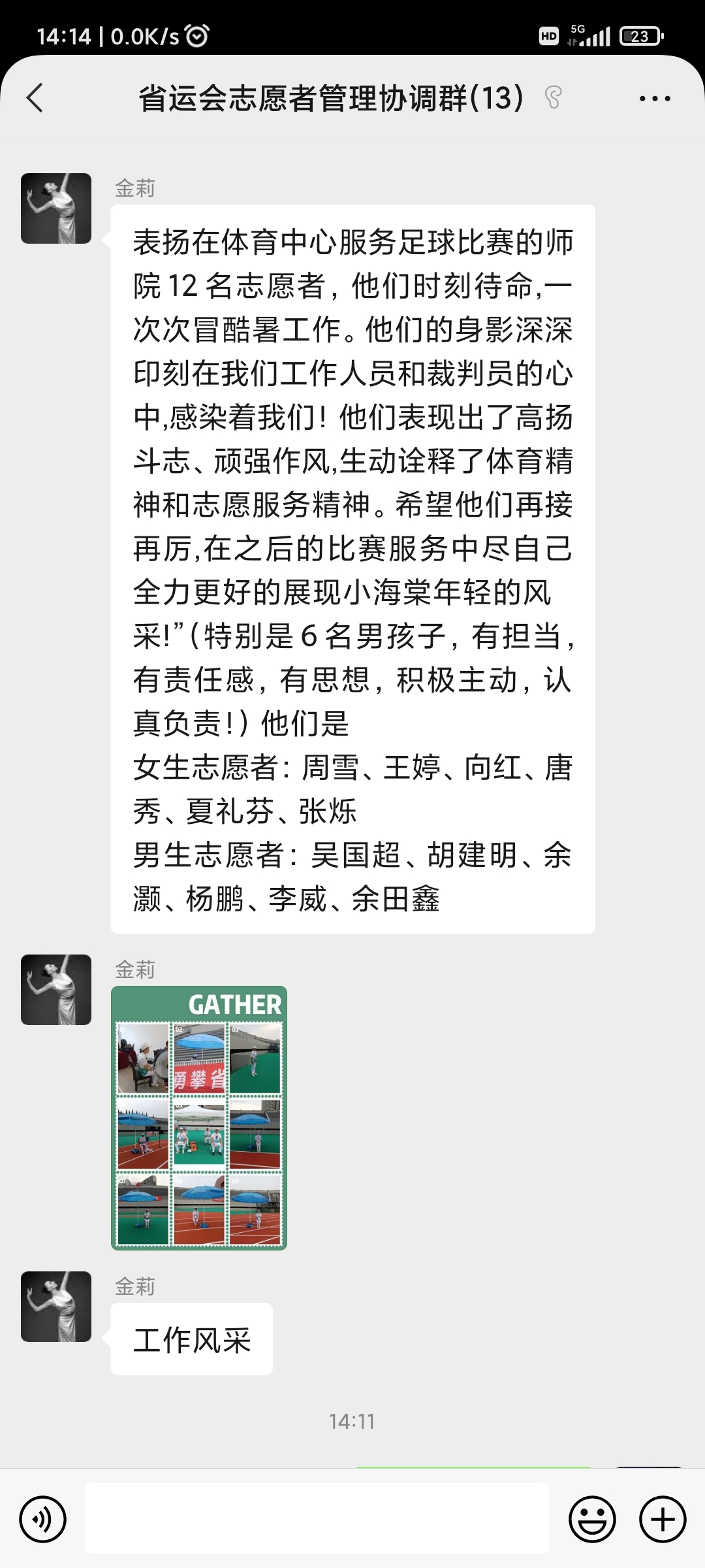 每天早上志愿者在汽车前等待运动员的身影、酷热之下志愿者活跃的身影、赛场旁志愿者坚守的身影无不展现乐师学子的模样;志愿者们在台前幕后活跃的身影生动诠释了体育精神和志愿服务精神;这批志愿者同学放弃假期,主动投身省运会志愿服务活动充分体现了新时代大学生的责任与担当。