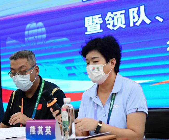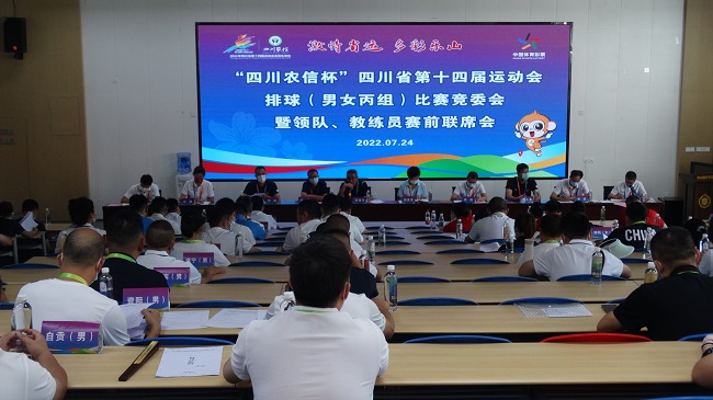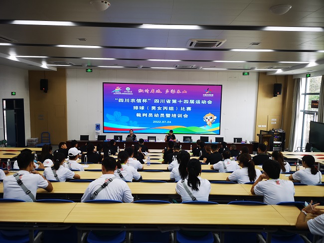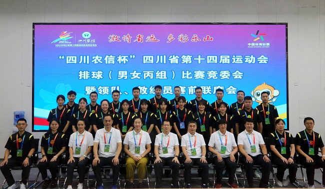 下午4:00,竞委会召开省运会排球(男女丙组)比赛竞委会大会暨赛前联席会议。会上,乐山市体育局党组成员、省十四运会竞赛部成员熊其英致欢迎辞,她代表乐山市对全体人员表示热烈欢迎,并祝愿各代表队取得佳绩。乐山师范学院体育学院院长张峰汇报了赛区组织架构、场地布置、设备调试、防疫措施、志愿服务等工作已全部完成,体育学院广大师生努力确保比赛能够顺利进行。四川体育职业学院党委委员、项目分管负责人段渝川对疫情防控、绷紧安全之弦、强化管理、赛风赛纪、反兴防兴等方面提出了严格的要求。