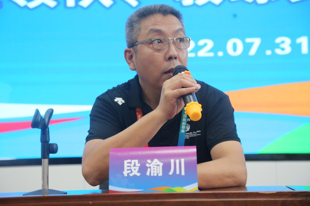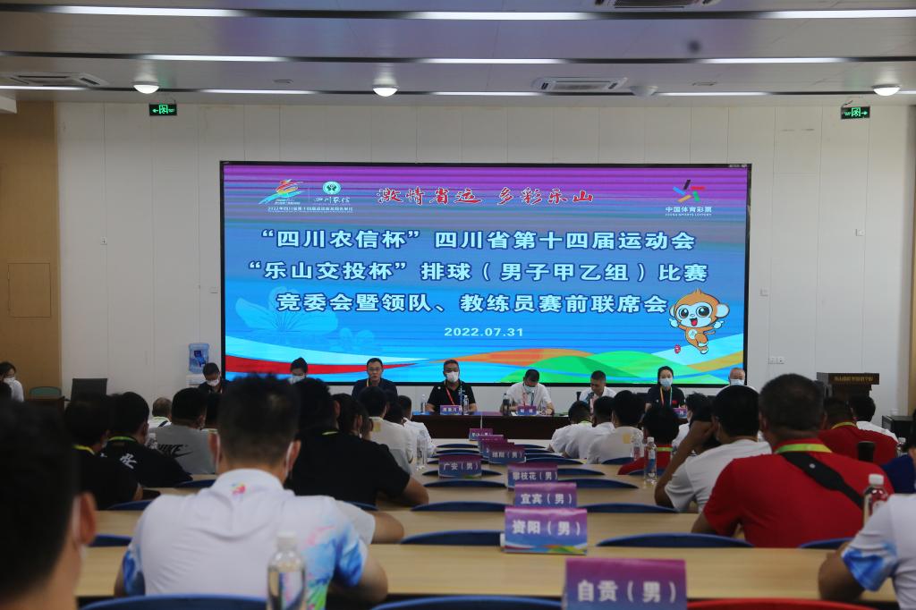 7月31日16:00,大会召开排球(男子甲乙组)比赛竞委会暨领队、教练员赛前联席会,会议由四川省排球协会常务副理事长主持。出席本次会议的有四川体育职业学院党委委员、项目分管负责人段渝川,四川体育职业学院排球运动管理中心党支部书记邹靖,乐山师范学院体育学院院长张峰,四川省体育局竞体处干部、排球项目管理员冷薇,乐山师范学院体育学院副院长黄河,四川省第十四届运动会兴奋剂检查官邓雪峰,大会裁判长唐照华,以及各参赛队领队、教练,技术代表、裁判团队,志愿者等。