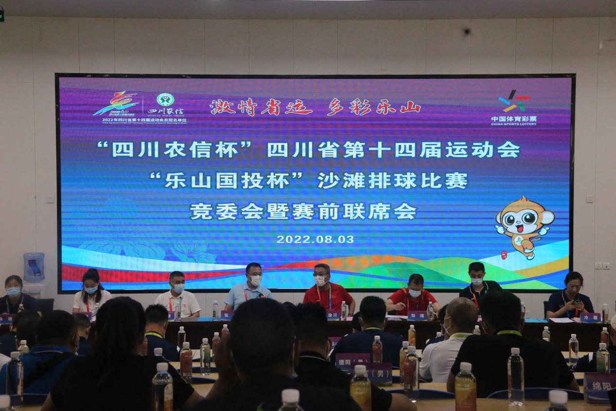 8月3日下午4:00,竞委会召开沙滩排球比赛竞委会暨赛前联席会。出席本次会议的有四川体育职业学院党委委员、项目分管负责人段渝川,四川体育职业学院排球运动管理中心党支部书记兼负责人邹靖,四川体育职业学院排球运动管理中心副主任张翔,四川省排球协会常务副理事长黄锋,乐山师范学院体育学院院长张峰,四川省体育局竞体处干部、排球运动管理中心项目管理员冷薇,乐山师范学院体育学院副院长黄河,大会裁判长朱珊以及各参赛队领队、教练,裁判员,志愿者等。