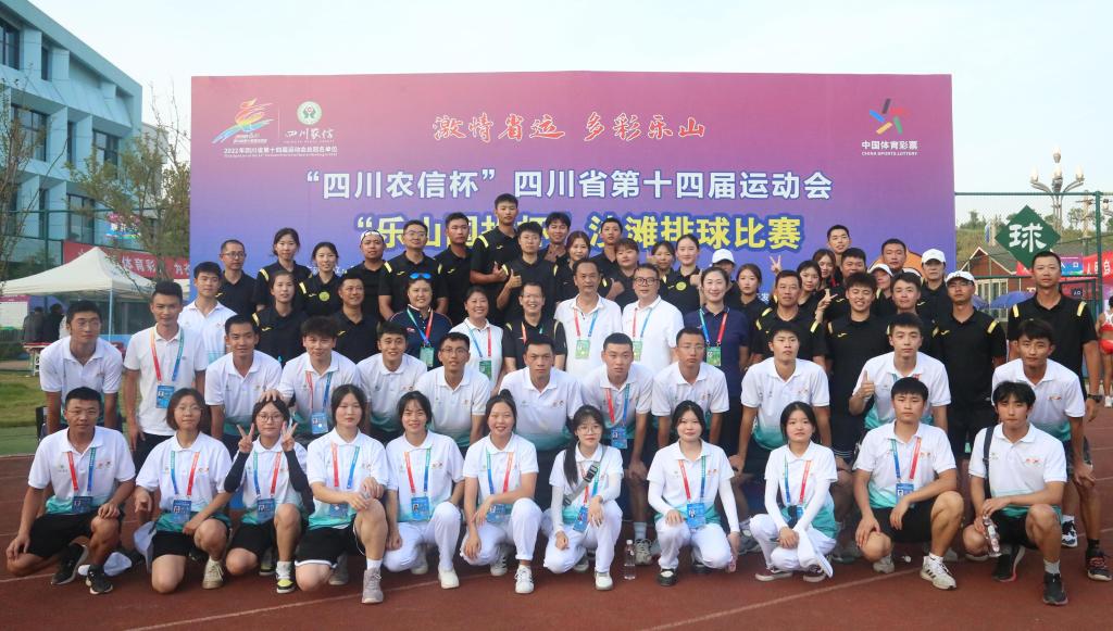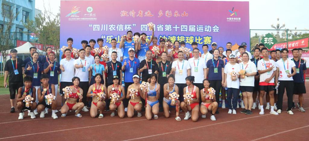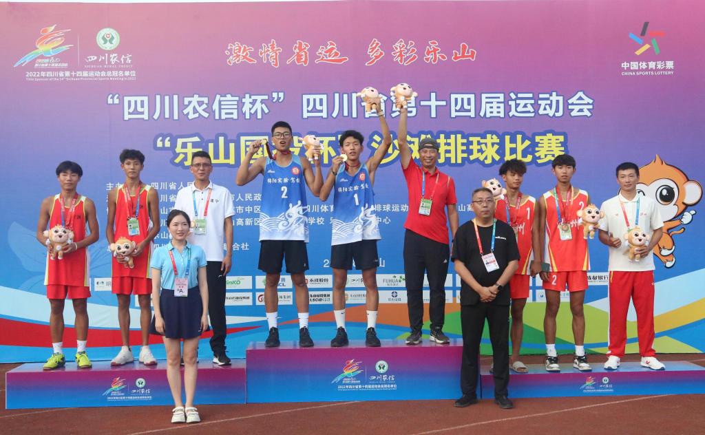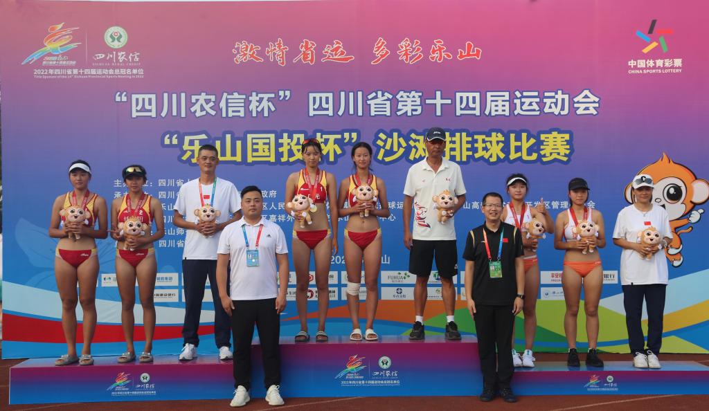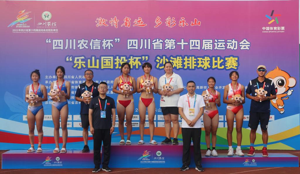 本网讯(文 夏川/图 刘李、刘凡嘉、向瑞雪)8月10日,“四川农信杯”四川省第十四届运动会“乐山国投杯”沙滩排球比赛进行了冠亚军争夺战,随即举行了颁奖仪式。