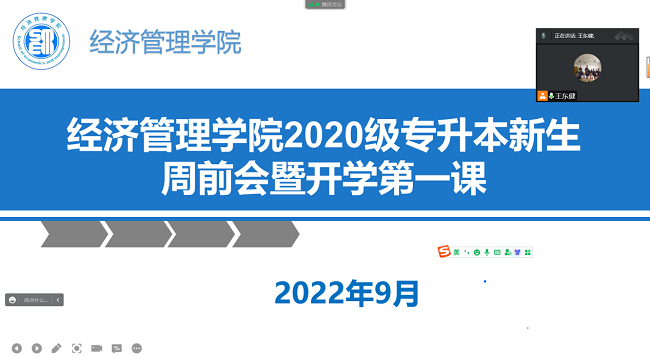 面对2020级专升本新生,辅导员老师进行自我介绍并表达了对大学两年与学生共同学习成长的展望。随后从学校、学院、专业等给同学们介绍了相关情况,之后又从开学前注意事项、在线教学需要注意的问题、疫情防控等问题进行了讲述。最后围绕大学规划,从“思想纯正、规则意识、集体主义和价值导向”等方面给同学们上了学前“第一课”。
