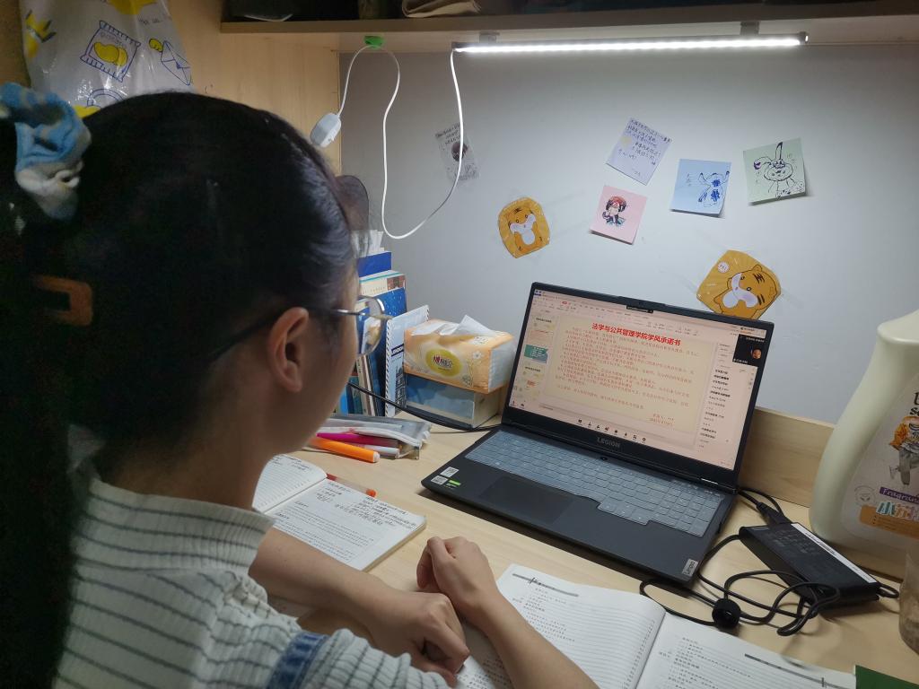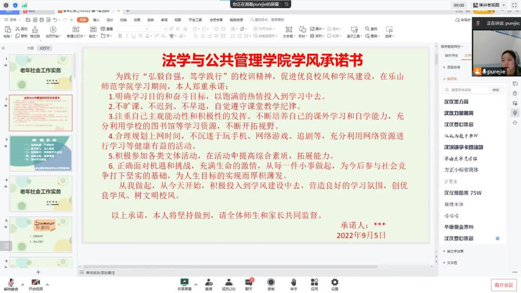 本网讯(文、图/赵丹)为加强师德师风建设,提升学生的学习积极性,营造优良学风,法学与公共管理学院各班级师生于9月5日在开学第一课上开展了线上学风师德承诺活动。