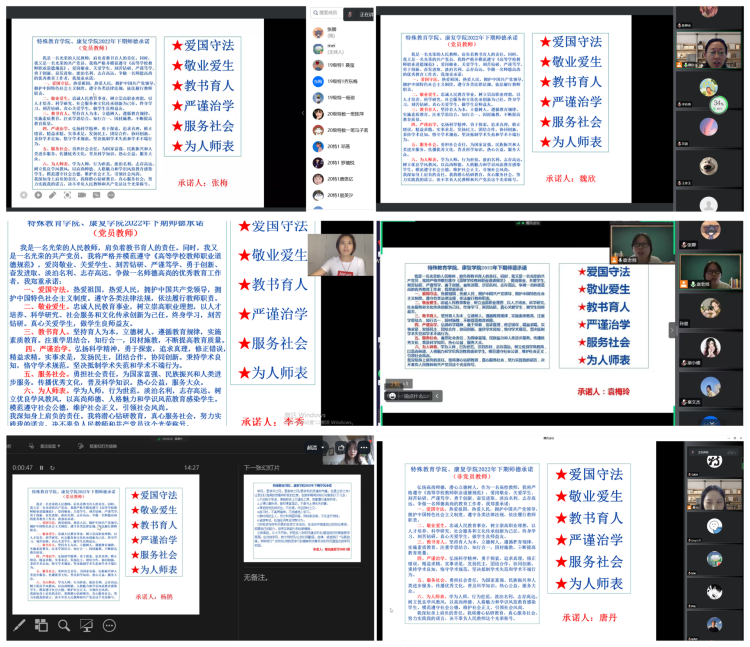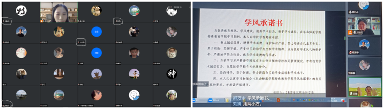 本网讯(文/张敏 图/授课教师) 9月5日是新学期线上教学的第一天,按照规定和学院的统一安排,特殊教育学院、康复学院的老师们自5日起在新学期的第一堂课上开展师德承诺活动。