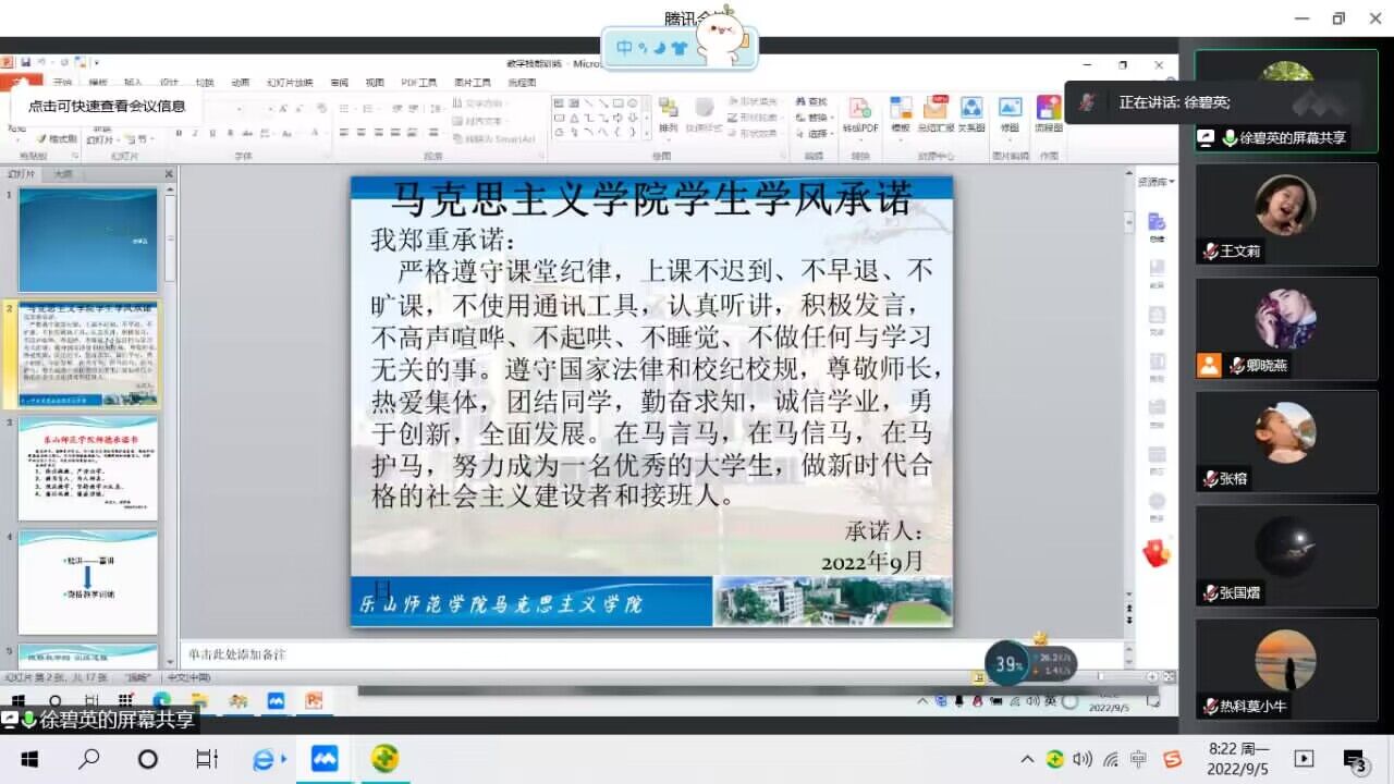 授课教师们首先进行了庄严的师德师风承诺,具体包括:“坚定政治方向、潜心教书育人、坚持言行雅正、遵守学术规范、秉持公正廉洁、积极奉献社会”等。每一句神圣的承诺都彰显出老师们以德立身、严谨施教的态度。同学们也在各班委的带领下,庄严承诺:“严格遵守课堂纪律,上课不迟到、不早退、不旷课,不使用通讯工具,认真听讲,积极发言,不高声喧哗、不起哄、不睡觉、不做任何与学习无关的事……”,铿锵有力的誓言展现出同学们崭新的风貌。马院学子们秉承在马言马、在马信马、在马护马的信条,他们也将带着这份承诺、守着一份初心,创设良好的学习氛围,在新学期继续努力。