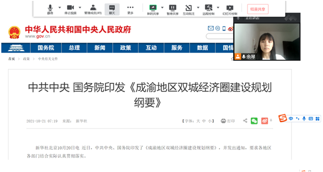 为了充分调动学生的学习积极性,加深其对《经济地理学》研究内容及实践意义的深入理解,余琴在教学中注意运用案例教学法。在当天的这节课中,她引入了“成渝地区双城经济圈建设”这一案例。课前,余琴老师上传了相关视频等学习资料,让学生提前阅读并查阅相关信息,熟悉案例背景。课堂上,她采取随机提问、连麦抢答等形式,引导学生积极参与案例分析,思考成渝双城经济圈建设对促进国内国际双循环、东西部均衡发展的重要意义,鼓励学生大胆发表见解,用经济地理学的思维去解读现实问题。