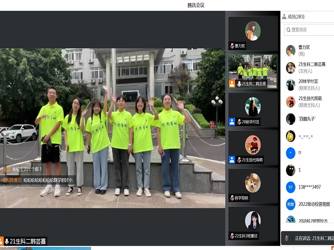 本网讯(文/代雨萌图/曹力欢)9月16日,生科学院300多名新生相聚云端,在线感受美丽的乐师校园。本次活动由学院新生班主任助理和高年级学生代表主持,2022级全体新生线上参与了活动。