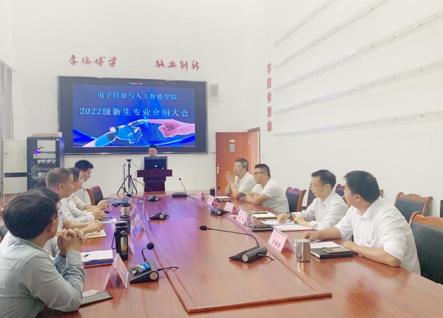 本网讯(文、图/肖苗)2022年9月17日上午9点,电子信息与人工智能学院2022级新生专业介绍大会在特教C栋501会议室隆重举行。学院党委书记蒋强、院长金澎、党委副书记方忠、副院长黄果、副院长青海银、计算机科学与技术专业负责人陈庆利、网络工程专业负责人张建东、人工智能专业负责人石战战、电子信息专业负责人李敏、电子信息工程(对口)专业负责人童强、全体辅导员和2022级全体新生参加。会议由学院党委副书记方忠主持。