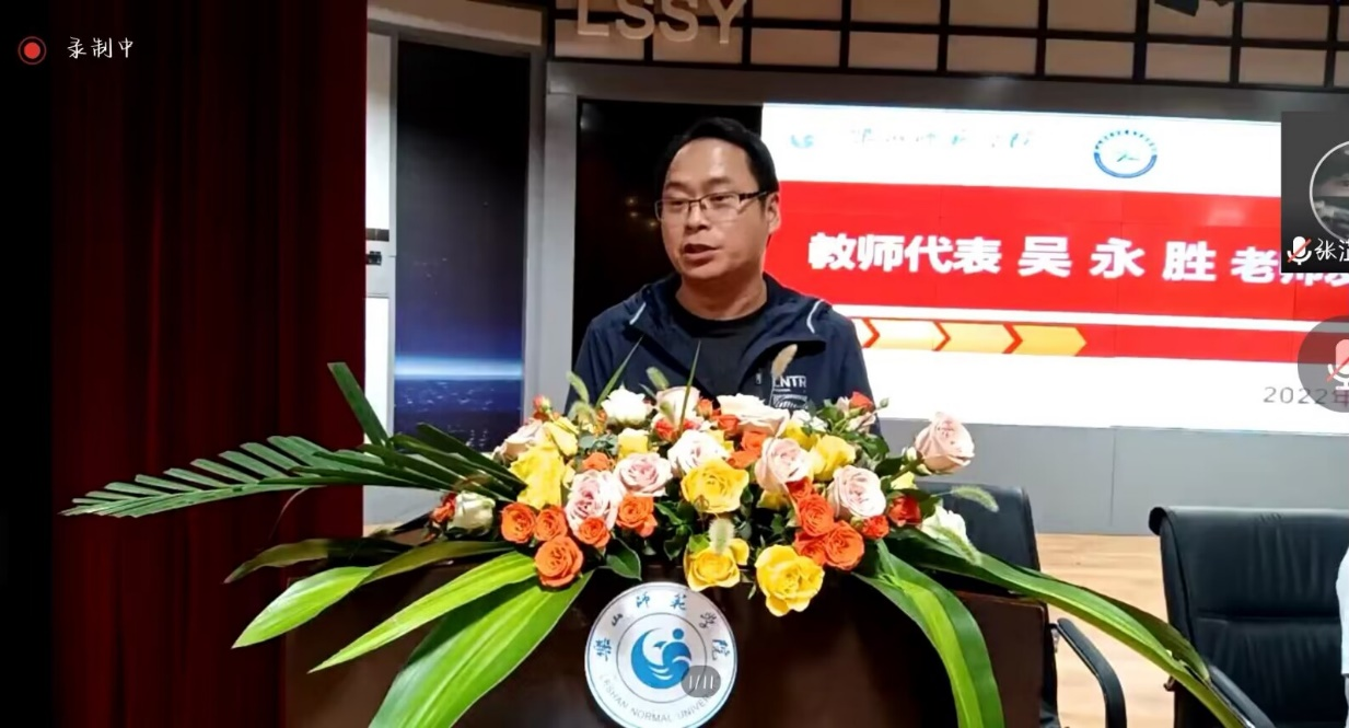紧接着,教师代表吴永胜博士以三句话作为礼物送给新生。第一句话“一切清零,再度出发”,让同学们将以前的事化为云烟,在大学中重新出发;第二句话“好好学习 天天向上”,希望同学们可以约束自己,认真对待每一堂课程;第三句话“自强不息,厚德载物”,讲述的是一种崇高的精神。这三句话,表现出吴永胜对同学们的美好祝愿,希望同学们可以在大学中放飞理想,勇毅前行。
