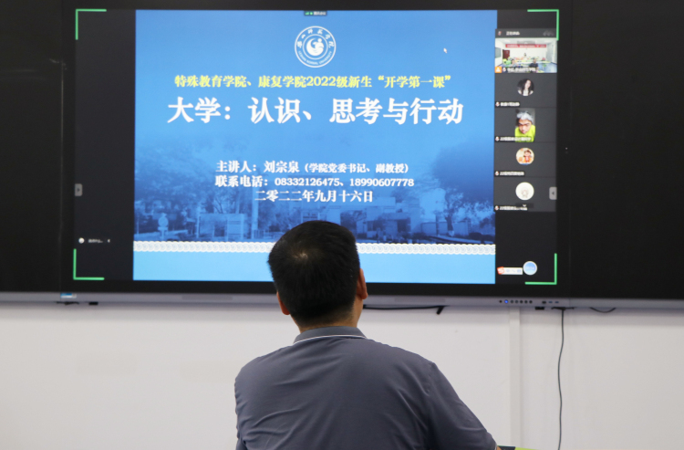课上,刘宗泉从认识、思考、行动的哲学角度诠释了什么是大学、为什么读大学以及如何读大学的问题,引领同学们真正认识以及科学对待大学生活。随后,详细介绍了学院的师资力量和组织结构,帮助同学们更好得认识学院、更顺利地开展大学生活。刘宗泉强调,“十四五”特殊教育发展提升行动计划,正加快推进特殊教育高质量发展,希望同学们抓住发展契机,传承特教领域优秀榜样的精神品质,深耕专业,在大学学有所成。