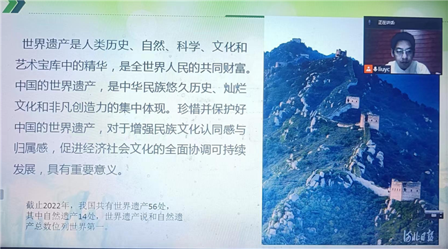 课堂上,刘延超对我国世界遗产所具有的杰出普遍性价值(历史价值、文化价值等)进行深入解读,他引导旅游管理专业学生结合自身旅游经历来理解世界遗产的重要意义,在研究和借鉴历史、开阔眼界的同时,注重培育学生的爱国情怀。结合中国世界遗产的具体案例,刘老师层层递进,向学生阐释了“一个国家、一个民族必须知道自己是谁,要到哪里去”“坚持人与自然和谐共生,人与自然是生命共同体,人类必须尊重自然、顺应自然、保护自然”等理念,并将中国传统文化知识有机融入到对中国世界遗产尤其是世界文化遗产、非物质文化遗产的讲解中。