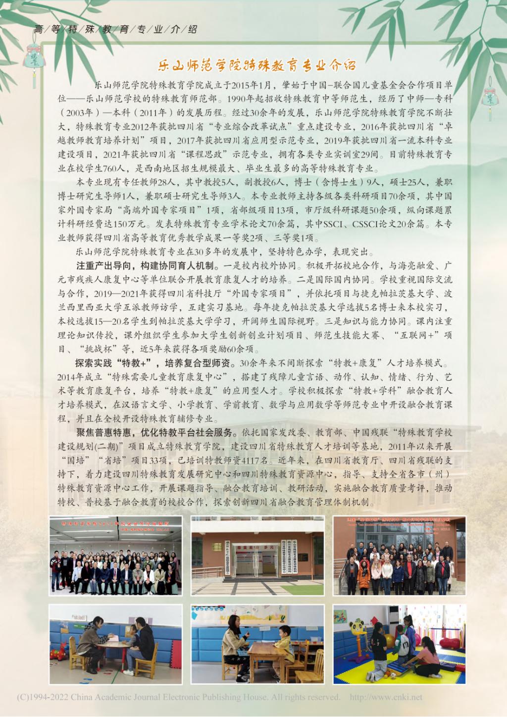 本网讯(文 图/王振洲) 近年来,特殊教育学院认真贯彻落实国家《残疾人教育条例(2017)》《“十四五”特殊教育发展提升行动计划》,全力对标竞进、争创一流,推动我校特殊教育事业持续高质量发展,得到《现代特殊教育》等专业学术期刊的认可和肯定。2022年9月,《现代特殊教育》(高教版)第六期刊载了我校特殊教育专业介绍的文章(见下图)。文章介绍了我校特殊教育专业的办学历史、学科专业建设成就、师资力量、办学条件、招生规模、科学研究和教研教改成果。还从“注重产出导向,构建协同育人机制”“探索实践‘特教+’,培养复合型师资”“聚焦普惠特惠,优化特教平台服务社会”三个方面介绍了学校特殊教育专业的办学特色。
