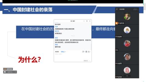 第三,坚持学生主体地位,提高课堂参与度。通过不断调整教学方式方法,张老师的线上课堂总体反馈良好,基本达到预期教学目标。但是,仍然存在个别学生挂机上课、不认真听讲的现象。为解决这一问题,张伟荣老师有针对性地增加课堂讨论交流频率。例如,让学生研讨“中国封建社会历史上曾出现过哪些盛世?它们最终都走向衰落,为什么?”等问题,并对学生的讨论发言进行分析,从政治、经济、文化、外交等领域分别加以讲解。再如,有关历史周期律问题,张老师先请同学们在课堂上畅所欲言提出各自的观点和疑问,再通过黄炎培和毛泽东就中国历史能否跳出周期律的“窑洞对”引出中国共产党跳出历史周期律支配的“两把钥匙”,给出令学生信服的解答。