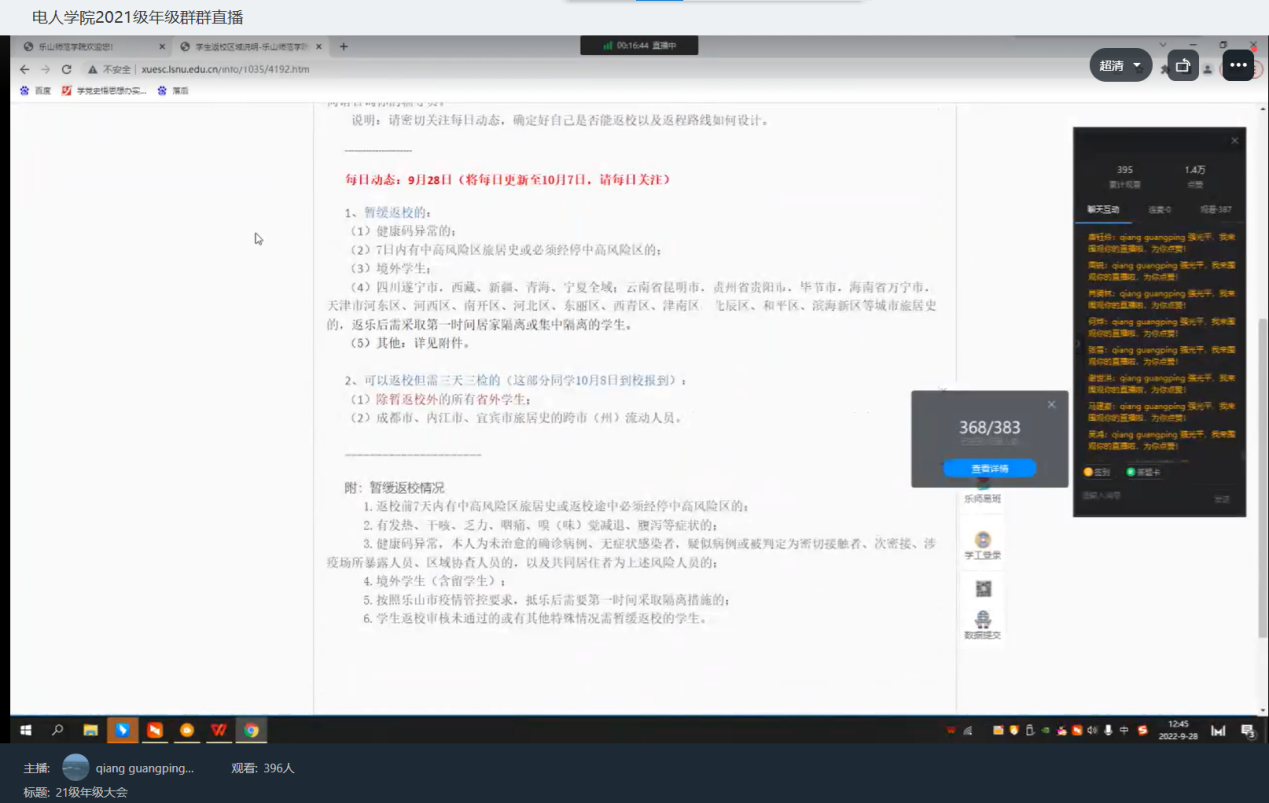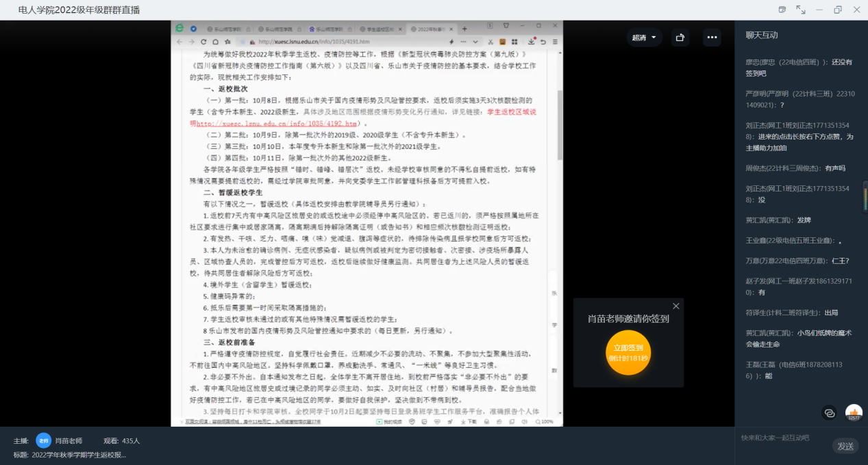 本网讯(文、图/蔡国娇)为做好我校秋季学期学生返校报到及疫情防控工作,电子信息与人工智能学院各年级积极响应,迅速落实,于9月28日分批召开线上秋季学期年级大会。辅导员谭红梅、雷雄锴、强光平以及肖苗分别主持各自会议,学院全体学生分年级参会。