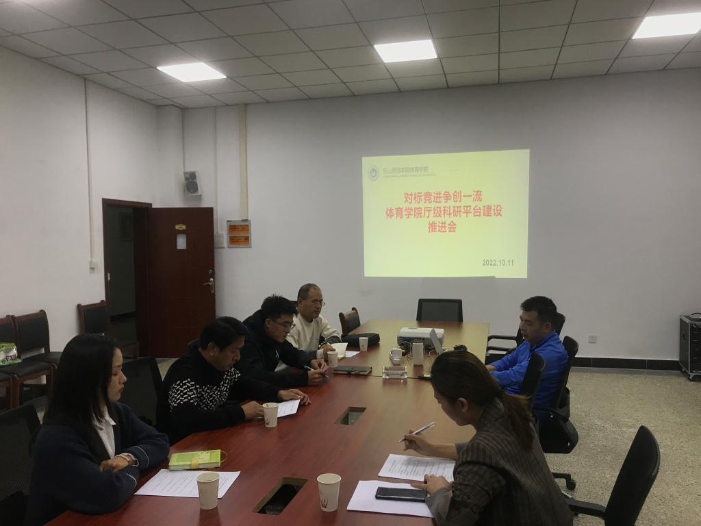 本网讯(文、图/张剑)为贯彻习近平新时代中国特色社会主义思想和党的十九大精神,全面落实体育强国战略,同时加强校地合作共同促进乐山市体育事业的发展,2022年10月11日,体育学院厅级科研平台建设推进会在体育学院会议室305召开,体育学院副院长张爱平主持,体育教育专业理论教研室主任王美、专任教师朱霖、刑尊飞、张剑、杨佳英参加了本次会议。