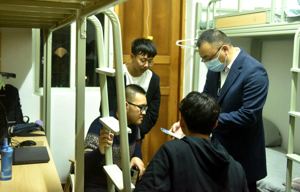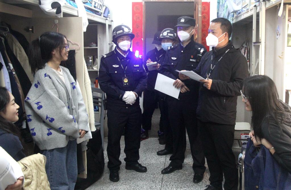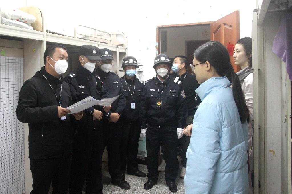 本网讯(文/吴天人 图/徐凌云、薛小丽)为确保学生返校后校园安全稳定,及时了解掌握新生返校后安全情况,10月12日晚,保卫处集中开展校园安全专项检查工作,市中区公安分局海棠派出所副所长李传伦随同参加检查。