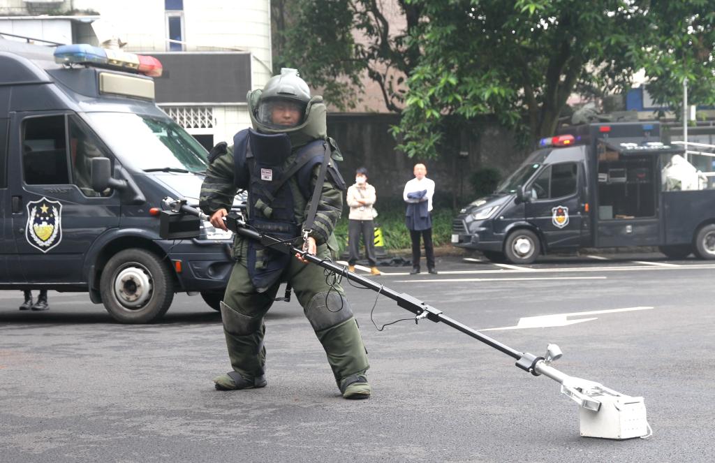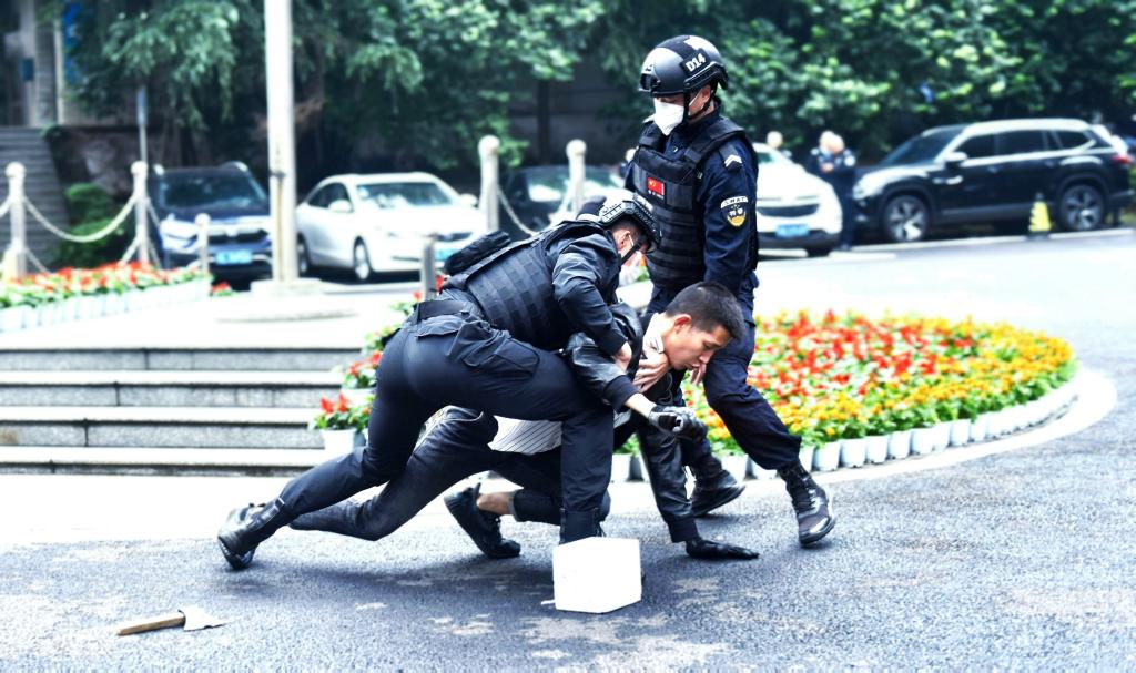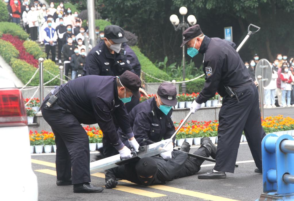 场景二:11时02分,一名暴徒扬言要在学校实施暴恐行为,并将随身携带的包裹放置于学校弘毅楼前广场。保安发现情况后立即将情况报告公安机关,学校工作人员上前安抚暴徒情绪,为特警和专业力量到达现场争取时间。校卫队警戒组快速拉设警戒线,隔离爆炸区域,驱散围观人群。暴徒无视工作人员的安抚,仍大声叫嚣要引爆炸药,情绪特别激动。特警支队专业排爆力量到达现场,突击组隐蔽于后方,伺机而动、果断出击,成功制服暴徒,迅速带离现场。至此,两起暴恐事件被公安机关与我校反恐防暴专业力量成功处置。