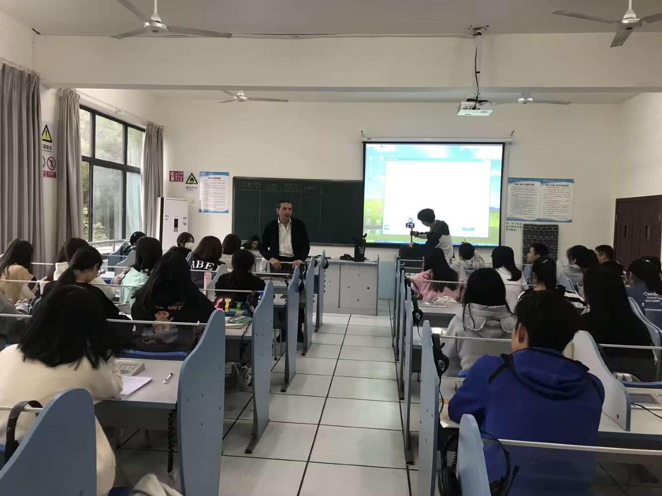 根据专业特点和课程要求,老师们集中采用腾讯会议和QQ直播等同步教学的方式以确保教学工作能有序开展。课堂上,老师们教学准备充分,同学们认真听讲,因疫情尚未到校的学生则通过线上平台与班级同学同步上课。在与线下学生互动的同时,老师们也时刻关注线上学生的学习动态,不时连麦提问。就教学巡查和课堂走访来看,外国语学院线上线下同步教学的授课方式基本满足了学生的学习需求、保证了学生良好的学习状态、实现了良好的教学效果。综上,我院教师教学准备充分,教学过程积极投入、学生课堂表现良好,线上线下同步教学工作井然有序。