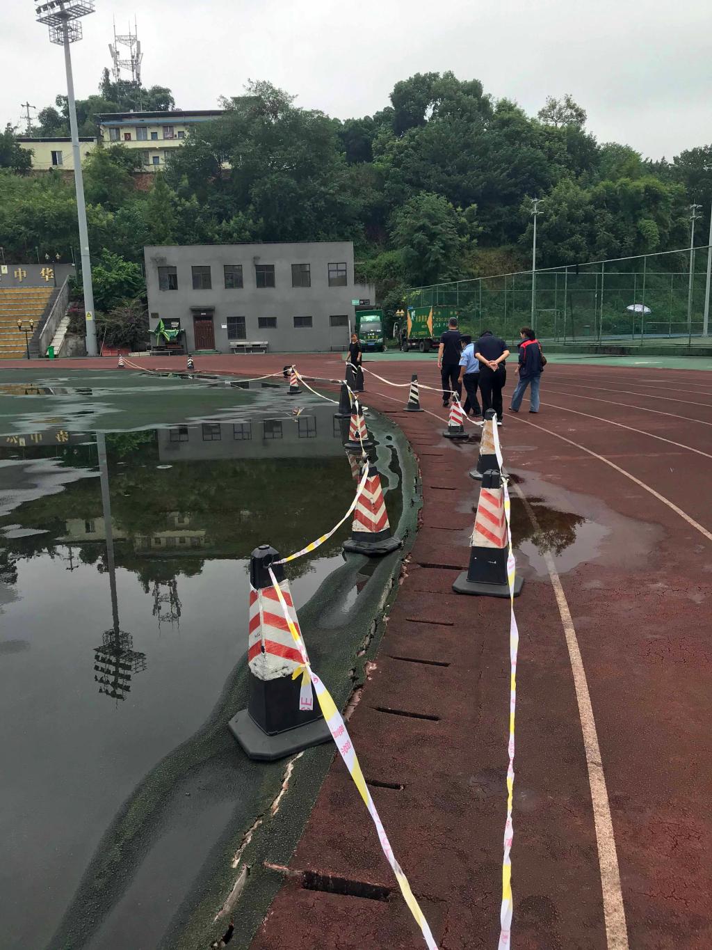北校区运动场是我校举办大型活动、体育教学、师生体育锻炼的重要场所。今年夏天,因极端天气爆晒和地震影响,北校区田径场跑道部分出现沉降、皲裂、塑胶毁坏的现象,对师生运动安全造成一定的影响,为解决以上问题,趁着国庆放假期间,我校实施了北校区运动场局部应急维修工程。北校区运动场局部应急维修工程主要内容包括:塑胶跑道局部重新铺设,排水沟、混凝土路面局部修复,淤泥清除等。