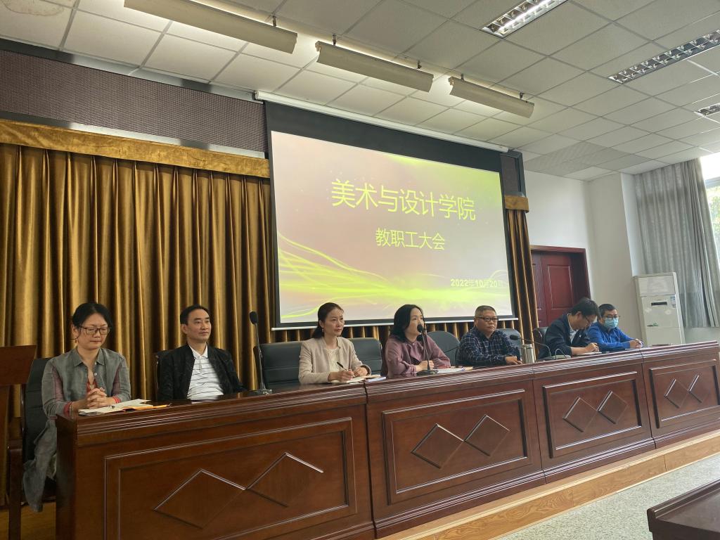 本网讯(图、文/曾清)10月21日下午,美术与设计学院于弘毅楼312召开教职工大会,会议由学院党委书记杨虹主持,全体教职工参会。