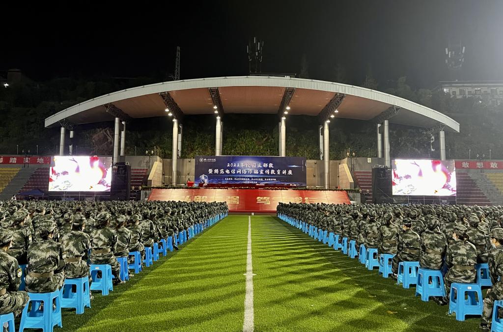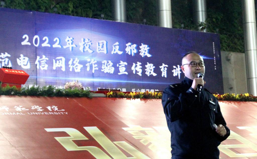 本网讯(文/杜鸿、宋博雯 图/薛小丽、罗英岚、张淑雅)为进一步增加师生识别抵制邪教和防范电信网络诈骗的能力,拓展防范宣传教育覆盖面,积极营造良好的校园环境和学习、生活氛围,10月20日晚,学校在北校区运动组织开展了反邪教暨防范电信网络诈骗宣讲教育讲座。学校党委常委、副校长李朝晖,乐山市公安局、乐山市委政法委、军训团全体成员5200余人参加了讲座。讲座由党委武装保卫部副部长梁光德主持。