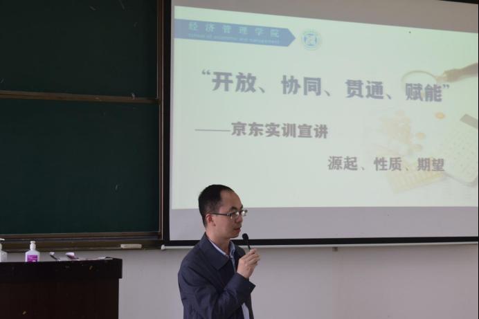 本网讯(图/李欣、文/文晨曦) 10月20日,经济管理学院于行知楼301教室开展京东实训宣讲会。经济管理学院党委副书记丁敏娜、副院长罗富民、学生科科长包天骏,三位京东主管及2020级经济与金融专业、人力资源专业学生等参加本次宣讲会。