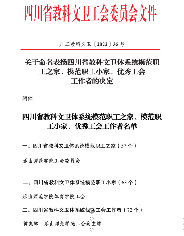 本网讯(文、图/刘兴龙)近日,四川省教科文卫工会印发《关于命名表扬四川省教科文卫体系统模范职工之家、模范职工小家、优秀工会工作者的决定》(川工教科文卫〔2022〕35号),命名表扬57个单位为“全省教科文卫体系统模范职工之家”,63个集体为“全省教科文卫体系统模范职工小家”,72名同志为“全省教科文卫体系统优秀工会工作者”。我校工会委员会荣获全省教科文卫体系统模范职工之家、体育学院分工会荣获全省教科文卫体系统模范职工小家、校工会副主席黄宽娜荣获优秀工会工作者的荣誉称号。