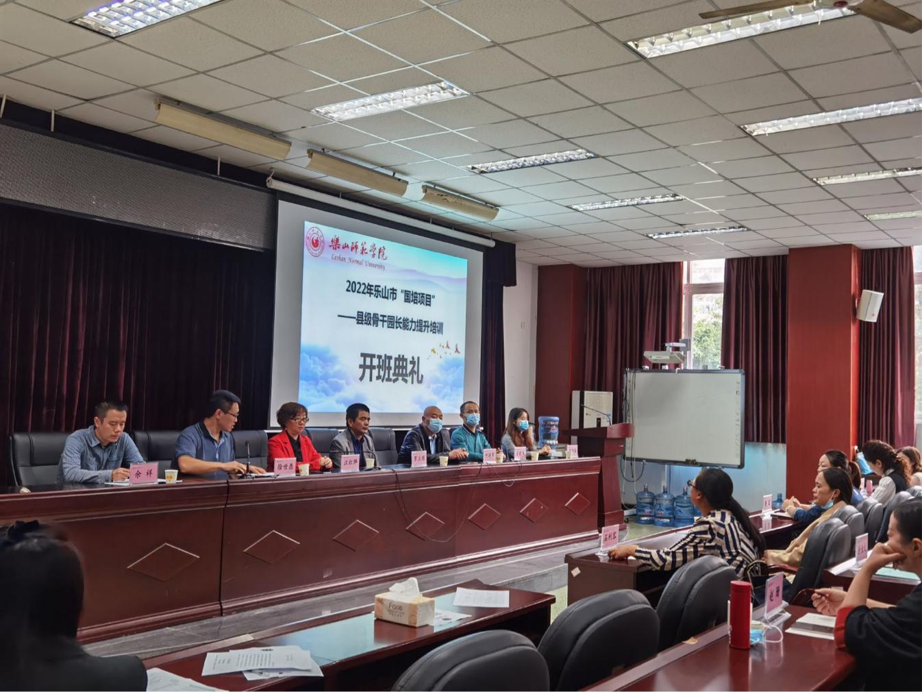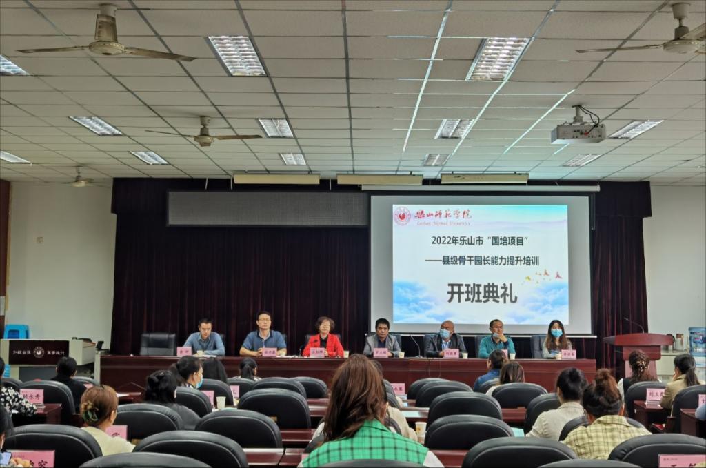 本网讯(文、图/詹海霞)10月22日上午,由乐山师范学院教育科学学院承办的“国培计划(2022)—县级骨干园长能力提升培训”开班典礼在弘毅楼412教室顺利举行。乐山师范学院教育科学学院院长、国培项目首席专家汪红烨、党委书记罗立顺、党委副书记兼纪委书记何晓军、副院长徐世鼎、副院长唐前军、学前教育系主任余祥、学前教育系副主任李非易和来自乐山市的40名非乡村振兴重点县乡镇公办园园长,参加了此次开班典礼,此次典礼由徐世鼎主持。
