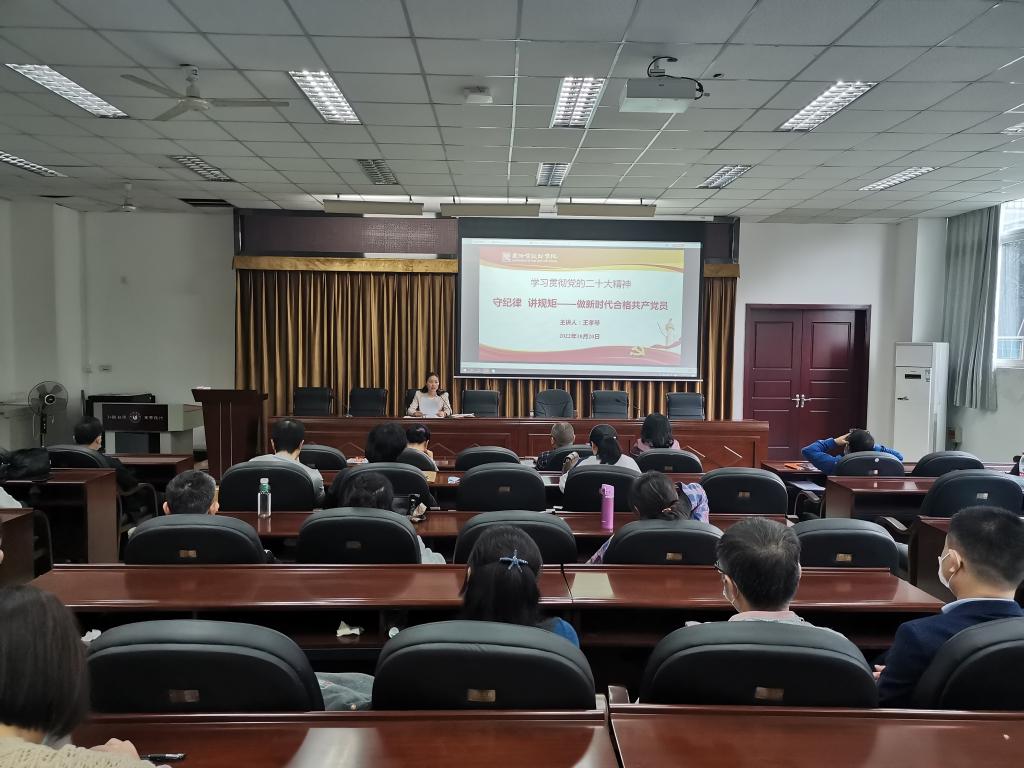 王孝琴向全体教职工作了《守纪律 讲规矩——做新时代高校“四有”好老师》的专题宣讲,结合《新时代高校教师职业行为十项准则》,要求全体教师要做到坚定政治方向、自觉爱国守法、传播优秀文化、潜心教书育人、关心爱护学生、坚持言行雅正、遵守学术规范、秉承公平诚信、坚守廉洁自律、积极奉献社会,努力成为有理想信念、有道德情操、有扎实学识、有仁爱之心的“四有”好老师,并重点强调了政治纪律和政治规矩。同时王孝琴向全体教职工党员作了《守纪律 讲规矩——做新时代合格共产党员》的专题党课,并组织全体党员观看了《党员干部要自觉守纪律讲规矩》的微党课视频。