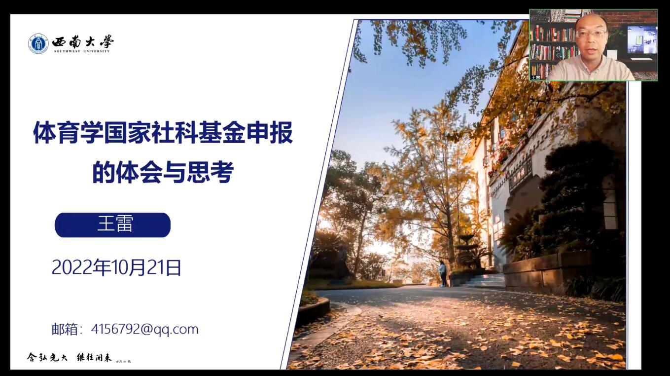 随后,通过视频会邀请王雷教授就“体育学国家社科基金申报的体会与思考”为题,从国家社科基金的基本属性与现状概述; 国家社科基金选题的思路与方法;课题申报书的撰写要点与注意事项。三个方面进行了详细的讲解。会后,部分老师就申报的相关问题与王雷教授做了交流。整场讲座内容充实,通俗易懂,气氛热烈,具有很强的实用性和指导性,老师们希望以后有更多的这种互动交流。