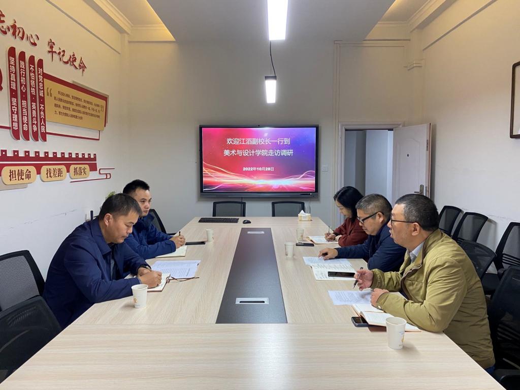 本网讯(文、图/曾清)2022年10月28日上午,学校副校长江滔、科研部副部长周勇到美术与设计学院指导科研工作,重点了解学院今年科研工作情况、科研发展中存在的困难与问题。美术与设计学院党委书记杨虹、院长熊泽文、副院长及学院科研负责人门涛参加了会议。